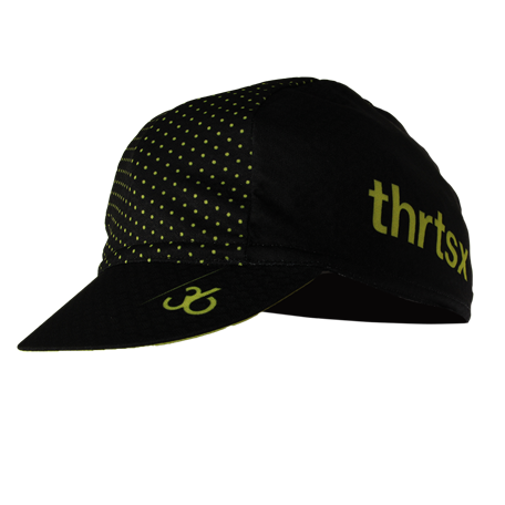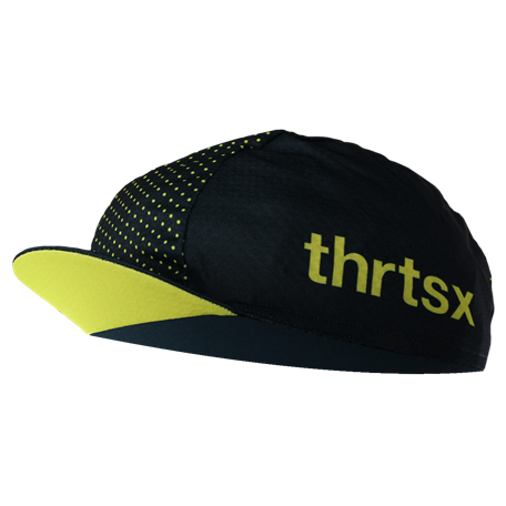 Wielerpet van een dun en ademend materiaal, in de kleur zwart met neon gele accenten. De pasvorm is ideaal voor onder een helm. Helpt om zweet te absorberen en een fijne klep tegen de zon.