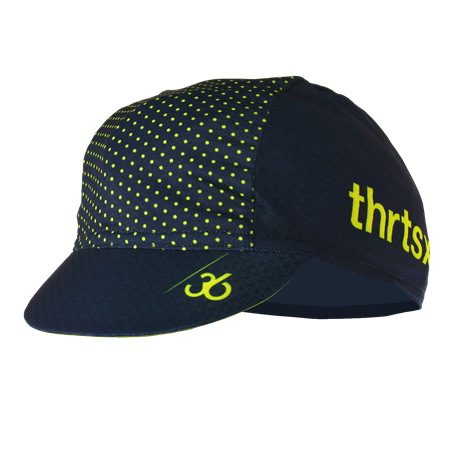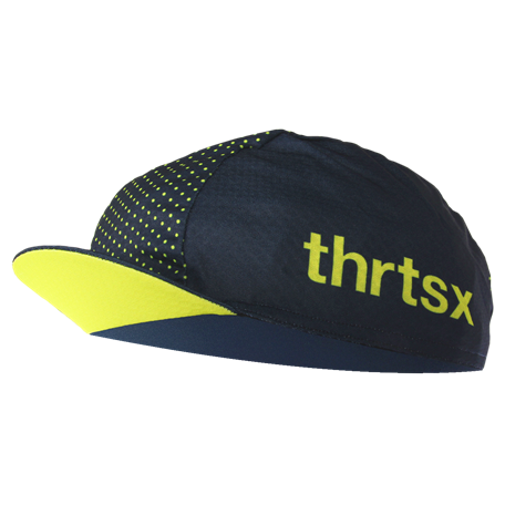 Wielerpet van een dun en ademend materiaal, in de kleur donkerblauw met neon gele accenten.
